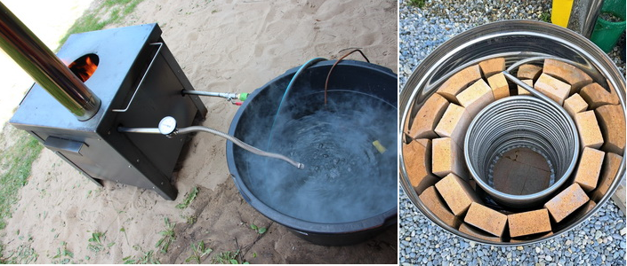 Das Wasser des 90 Liter Speißkübels fängt nach ca. 40 min. an zu kochen... Der Ofen sollte richtig heiß werden, die Edelstahlspirale hält das ohne weiteres aus.
