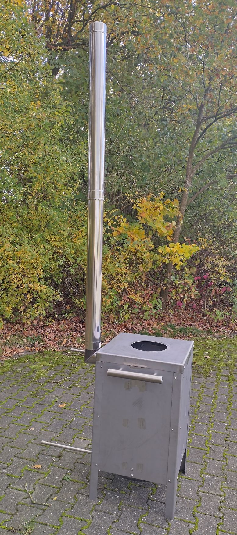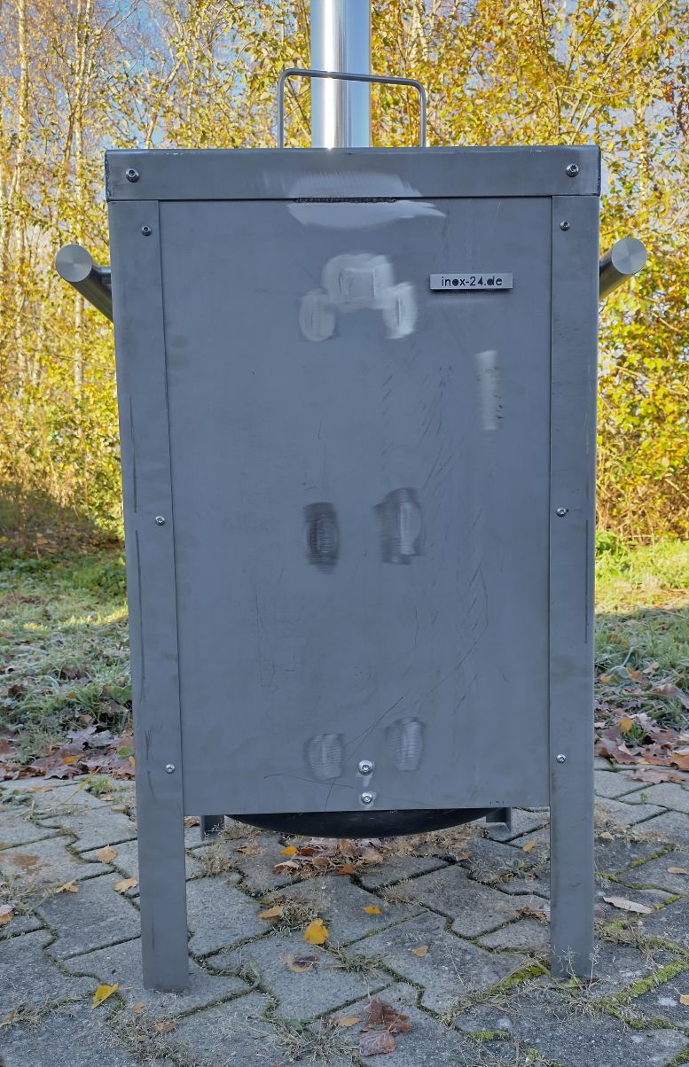 Der Ofen gehört nicht zur Gruppe der festen Kaminöfen oder Kachelöfen und unterliegt somit nicht dem Bundesimmissionsschutzverordnung (1. BImSchV), da Öfen für Badetonnen, Saunen, etc. soweit sie im Garten aufgestellt werden, Feuerstellen sind, die kurzzeitig zum Vergnügen genutzt werden. Nähere Informationen erhalten Sie von Ihrem Schornsteinfeger. Der Ofen muss so aufgestellt werden, dass sich weder im vorderen Bereich des Ofens, noch des Schornsteines brennbare Materialien wie z.B. Bäume/Holz befinden. Der Unterboden muss einen sicheren Stand gewährleisten und aus nicht-brennbarem Material bestehen. Der Bereich um den Ofen muss gegen Berührung geschützt werden, so das vor allem unbeabsichtigter Kontakt (u.a. von Kindern) verhindert wird. ACHTUNG – Verbrennungsgefahr! Die Rauchentwicklung sowie Windrichtung muß berücksichtig werden so das Dritte nicht betroffen sind.