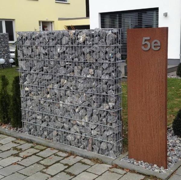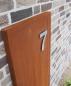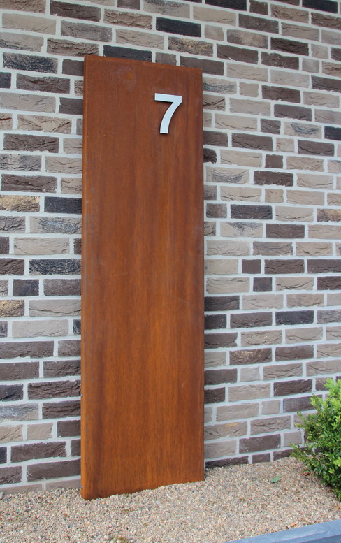 Cortenstahl Stele (7 bzw. 5e) mit Edelstahl Ziffern.